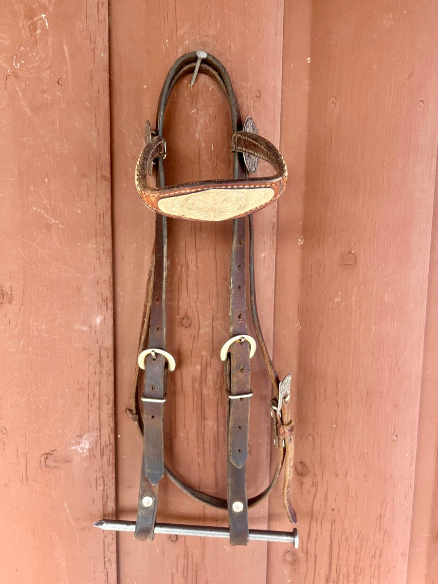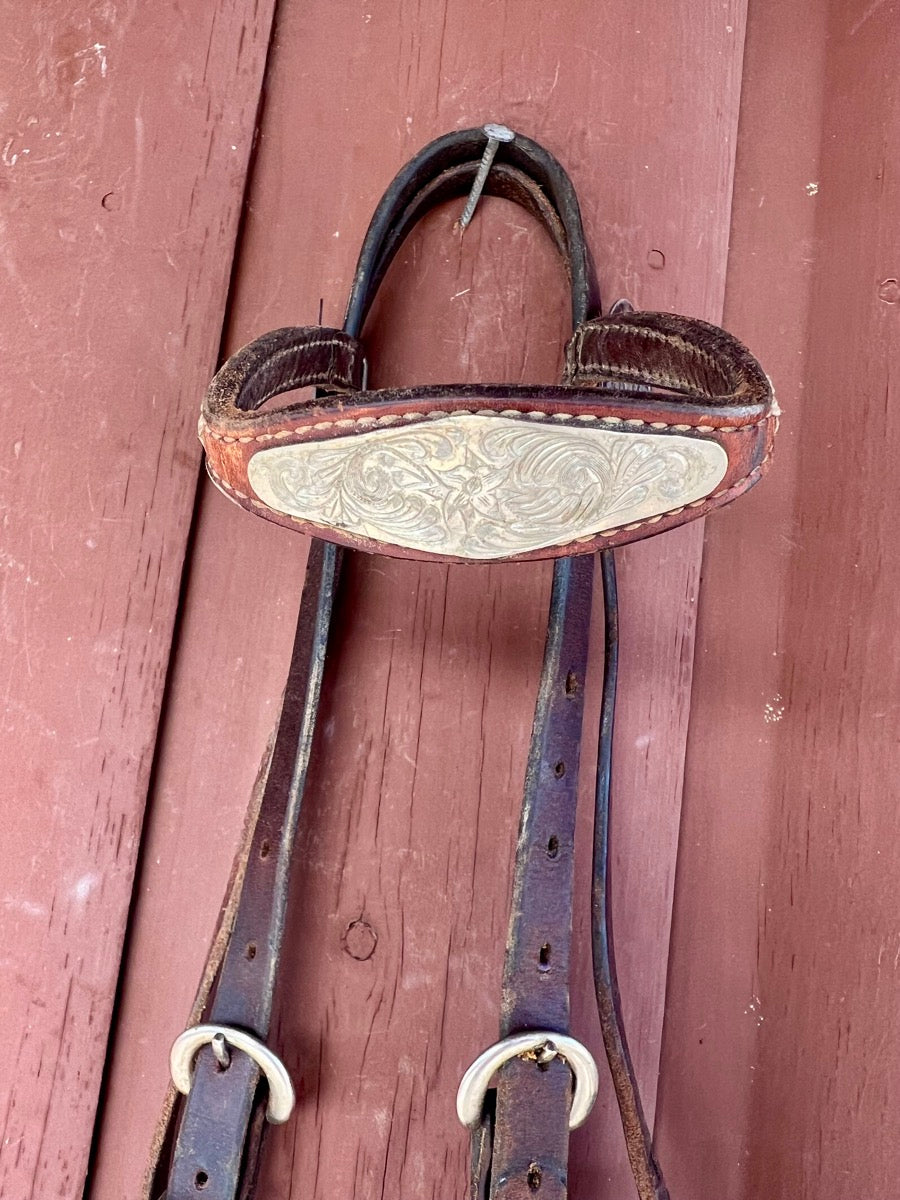 Pre Owned Leather Browband Headstall with rawhide and silver accents.
