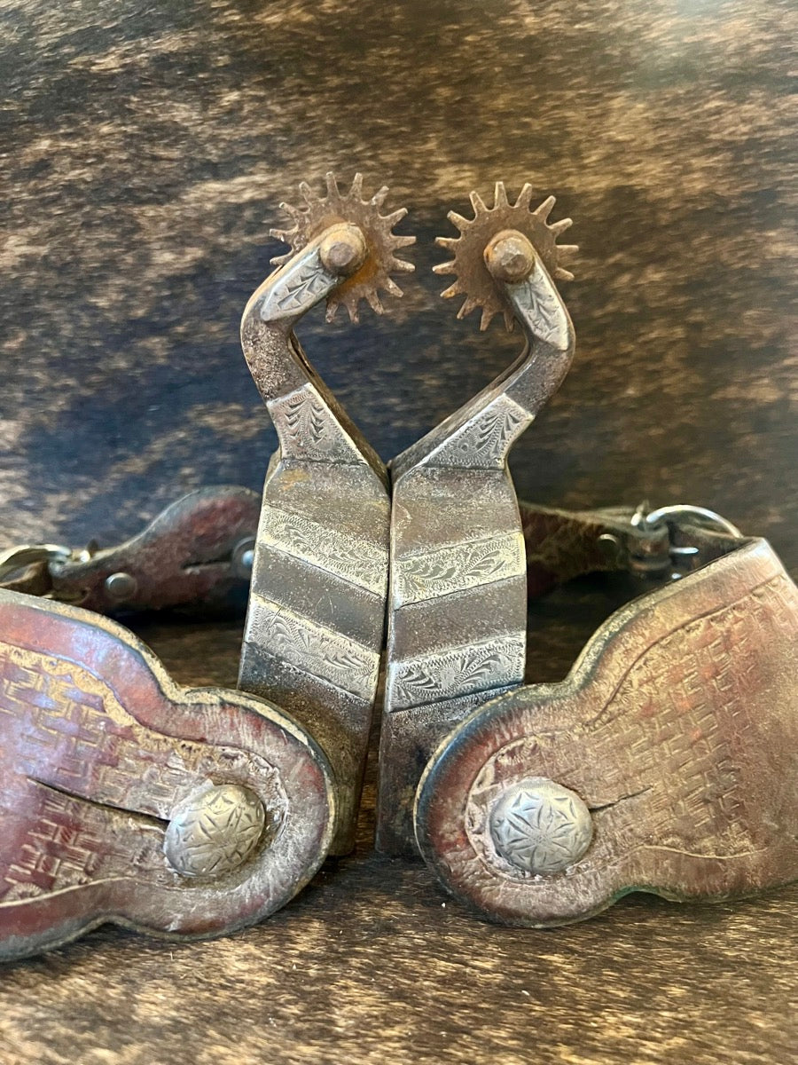 Vintage Crockett Renalde Spurs with Leather Basketweave Stamped Spur Straps