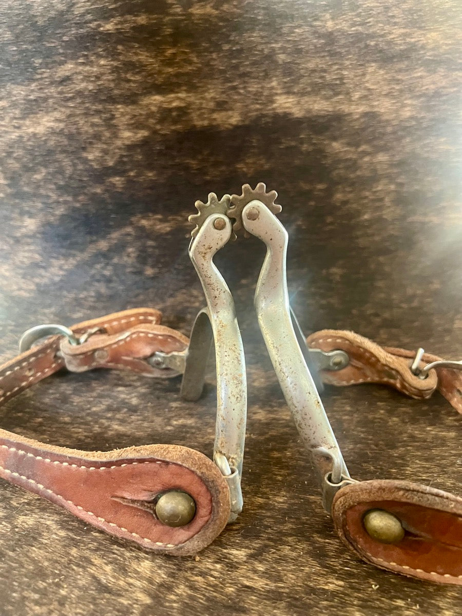 Vintage Metal Western Spurs with brass rowels and buttons on Leather Spur Straps