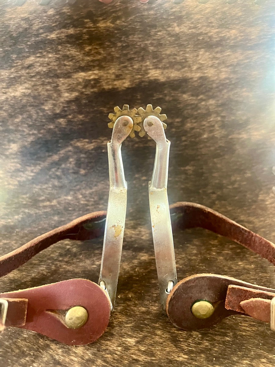 Vintage Metal Western Spurs with brass rowels and buttons on Leather Spur Straps