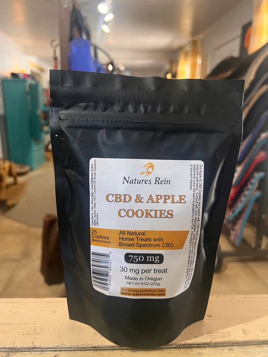Nature’s Rein CBD & Apple Cookies for horses are made with 30mg each of Broad Spectrum CBD. These tasty treats may provide help with sore muscles & joints, anxious behavior, pain & inflammation, and digestive issues.