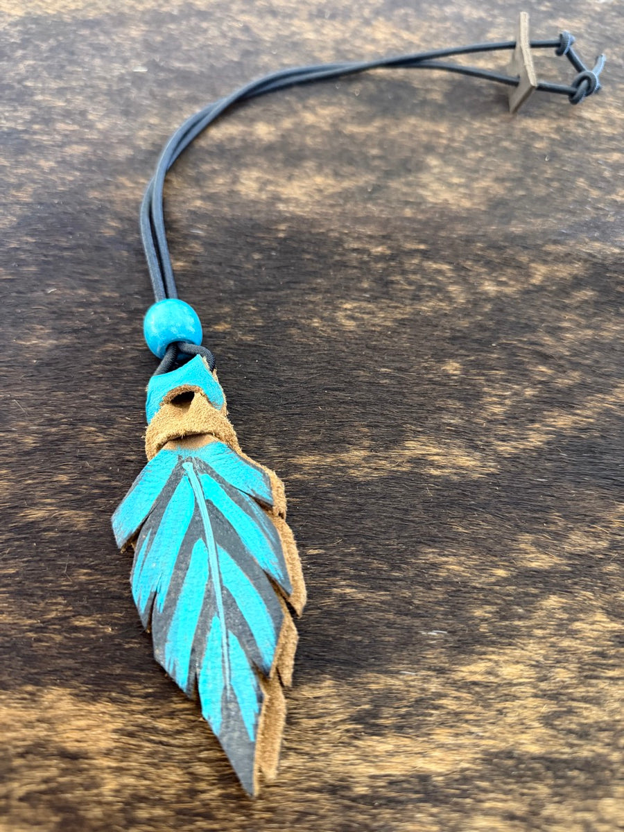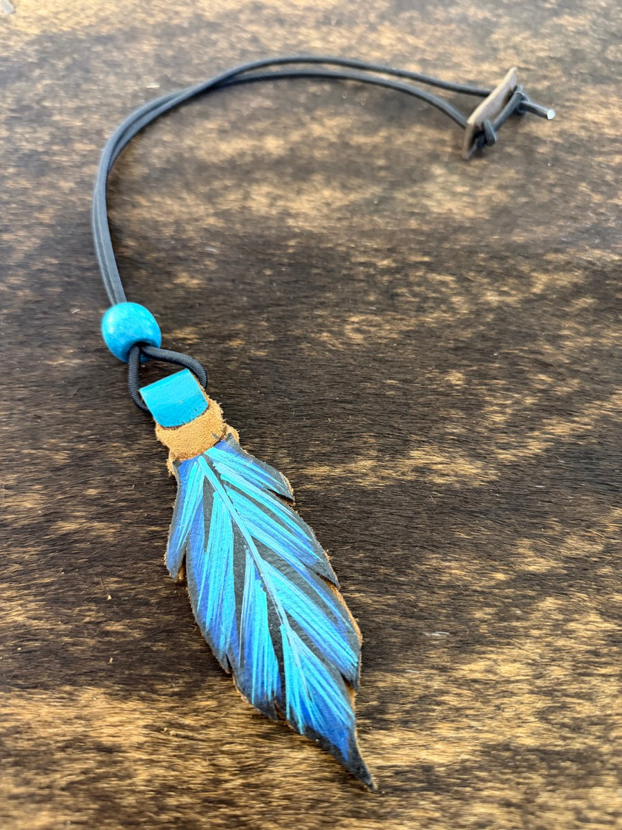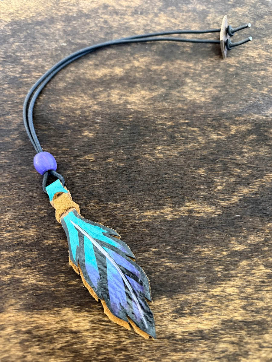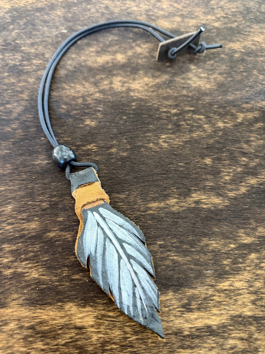 These bungee rope holders each have a handcrafted, hand painted, two-sided, leather feather on the end.
