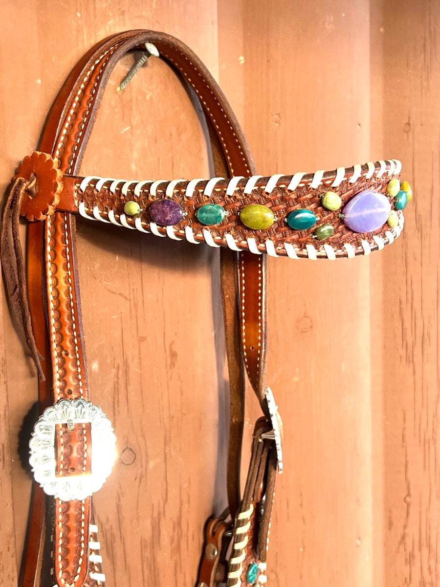 This is a medium oil, soft, supple leather Billy Cook tack set embellished with beautiful gemstones.