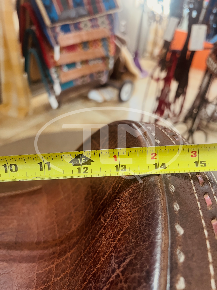 This 13.5" Wide Double J Pozzi barrel saddle has beautiful light pink buck stitch.