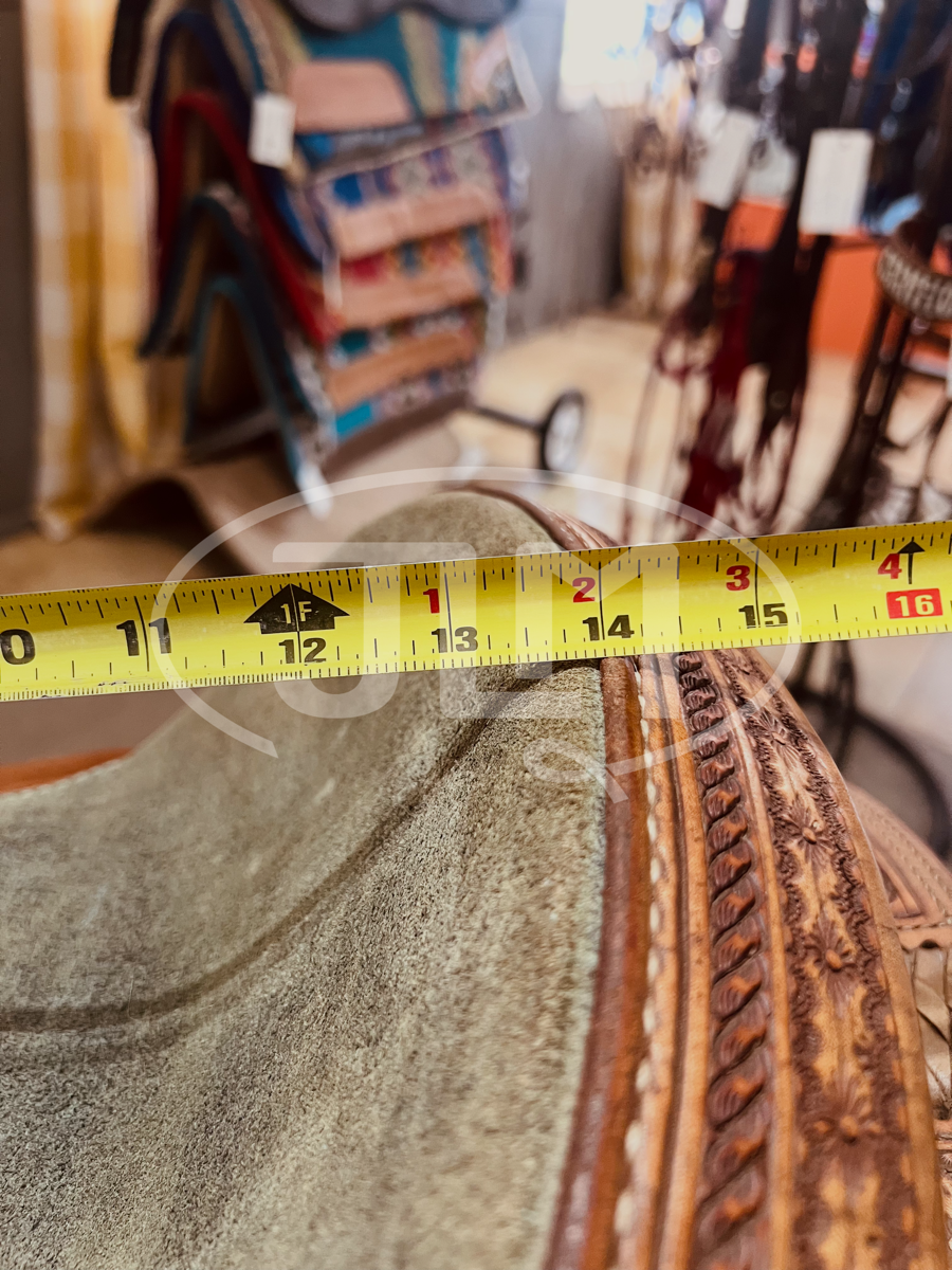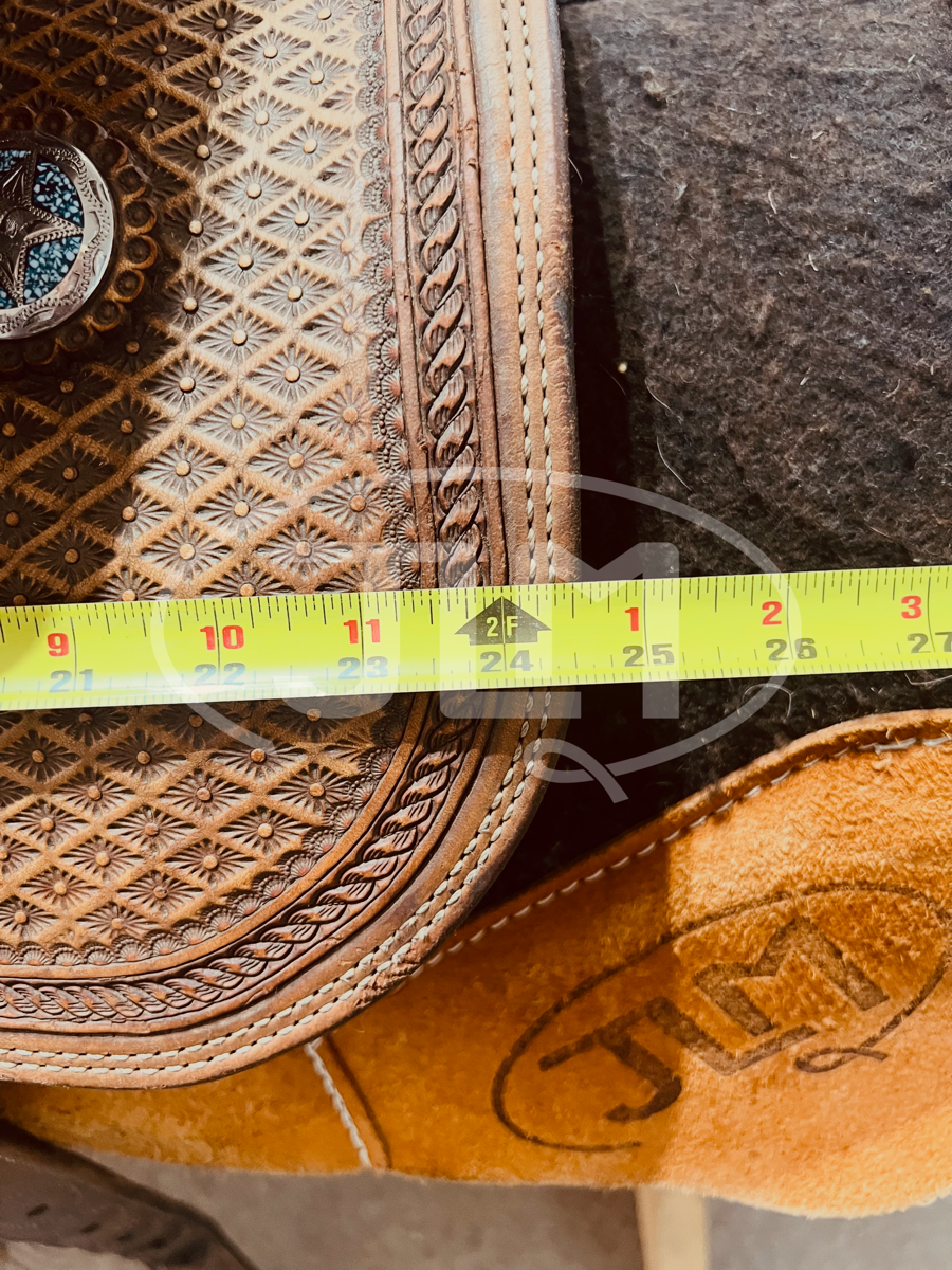 The stamped pattern on this saddle is stunning. Includes stirrups.