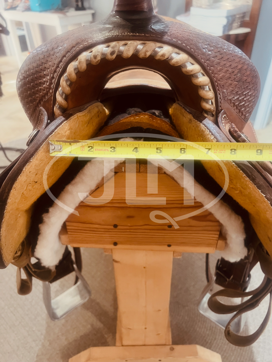 Without the rise to the front of the saddle seat and with the center ride seat pocket, wasted space in the saddle is eliminated. If you normally ride in a 15 1/2 saddle you may want a 13 1/2 or medium in our saddles. Yes, our saddles are different.
